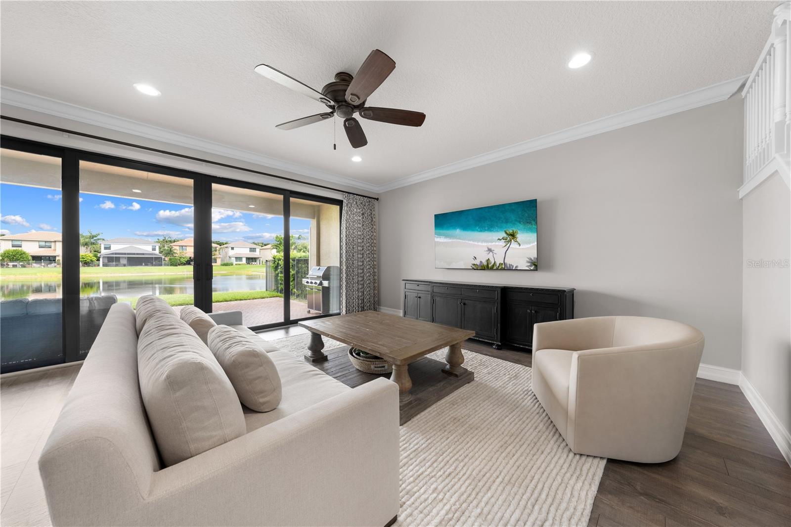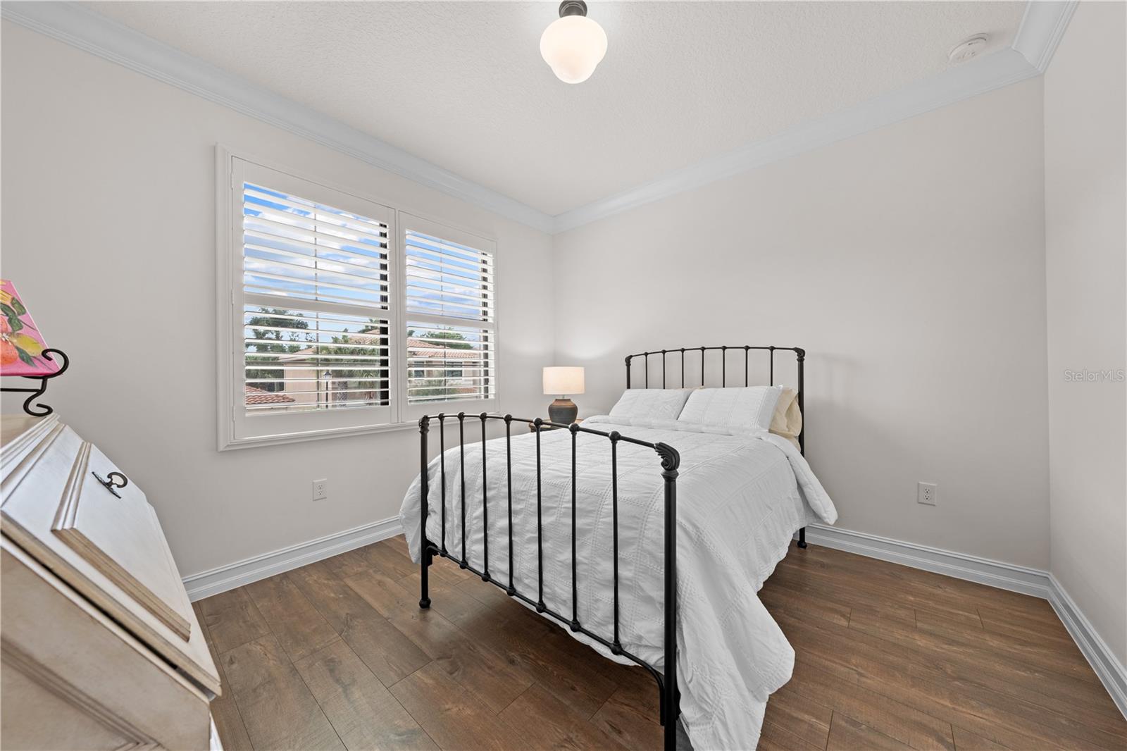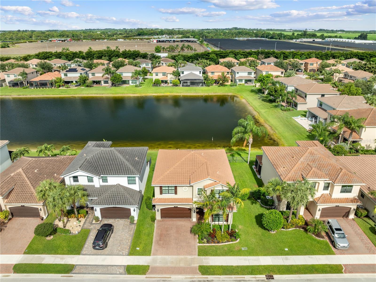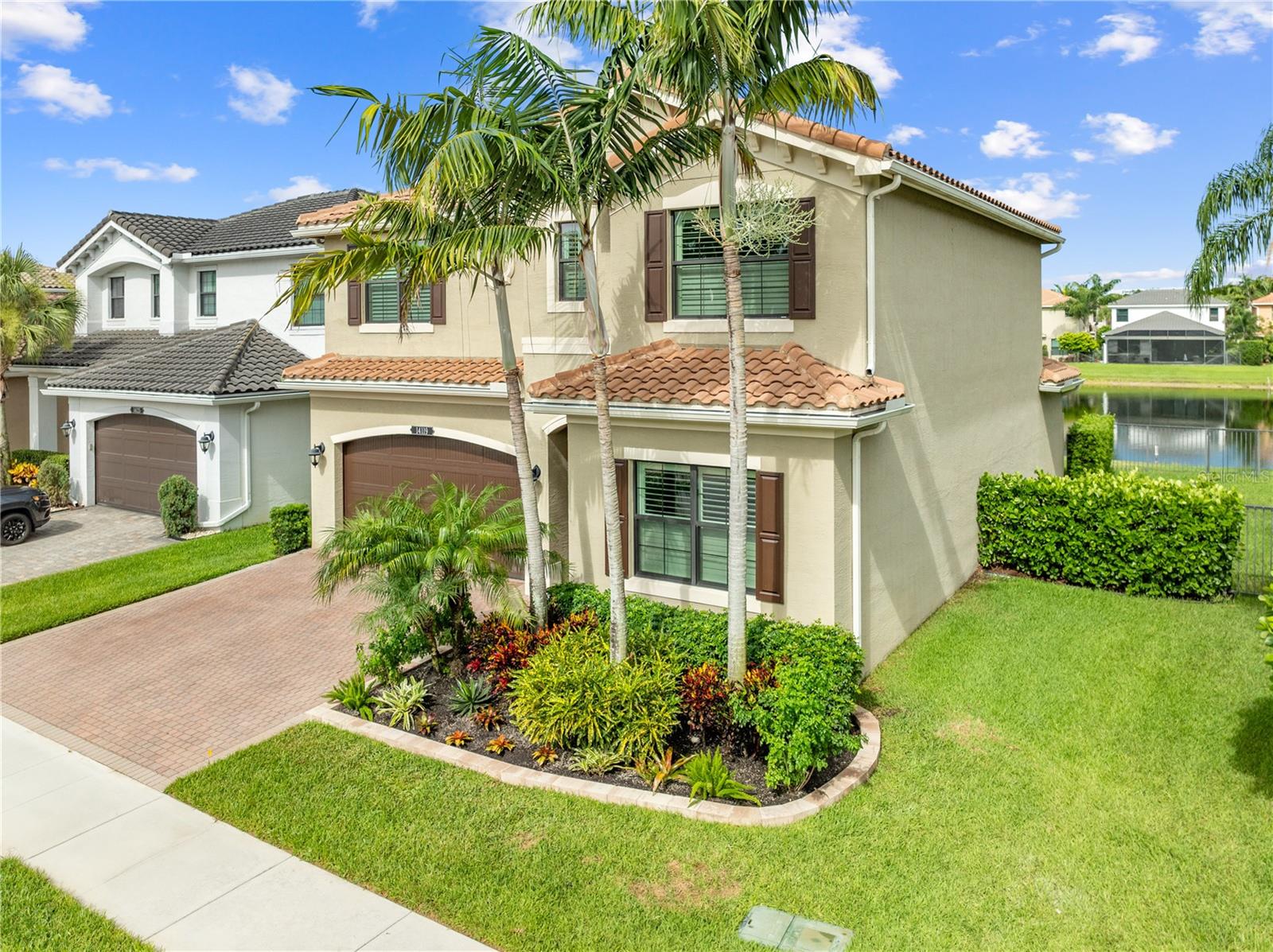 Welcome to this beautifully maintained, move-in ready two-story home, ideally situated on a premium lot with scenic water views in one of South Florida's most desirable gated communities. This 24/7 guard-gated neighborhood offers the perfect blend of resort-style living and everyday comfort.Step inside and experience timeless elegance paired with functional design. Wide-plank luxury vinyl flooring flows seamlessly through the main living areas and bedrooms, complemented by crown molding throughout. Plantation shutters provide privacy and style on the hurricane-impact windows, while custom drapery accents the sliding glass doors that open to an extended brick-paver patio--perfect for relaxing or entertaining. An extended brick-paver driveway adds both curb appeal and convenience.The entertainment-style kitchen is the heart of the home, featuring soft-close cabinetry, quartz countertops, a range with double ovens, an oversized island with surrounding storage, and an extended counter for casual seating and meal prep. A custom pantry adds additional organization. All kitchen appliances were installed in 2023. The kitchen opens effortlessly to the dining area and living room, creating a bright and open-concept living space.A full bedroom with a custom walk-in closet and a full bathroom are conveniently located on the first floor--ideal for guests or multigenerational living. Upstairs, you'll find a spacious secondary living area/flex space, a generous primary suite with two custom-built walk-in closets, and a private en suite bath featuring a garden tub. Two additional bedrooms and another full bathroom are also upstairs, along with a walk-in laundry room featuring tile flooring and abundant storage.Additional features include soft-close cabinetry and tile flooring in all bathrooms and the laundry room. A new air conditioning unit was installed in May 2025 for added peace of mind.The HOA provides exceptional value, covering lawn service, tree trimming, sidewalk pressure washing, and more--helping to keep the neighborhood pristine and worry-free.Residents also enjoy access to vacation-style amenities, including: A resort-style heated pool (winter) and cooled system (summer),canopy-covered seating, a splash pad, and covered playground.Indoor and outdoor basketball courts, pickleball and tennis courts, and a fully equipped, air-conditioned fitness center, and a stylish clubhouse with indoor card room and rentable event space.Lush tropical landscaping surrounds the entire community, creating an upscale, family-friendly atmosphere you'll love coming home to.