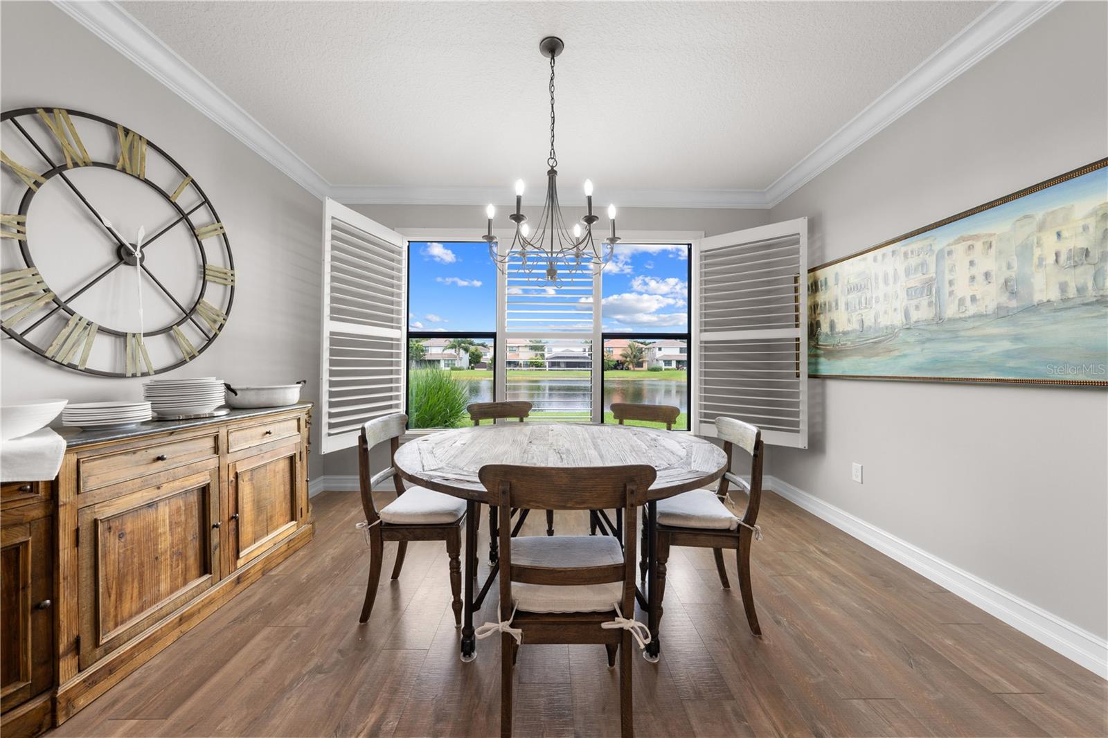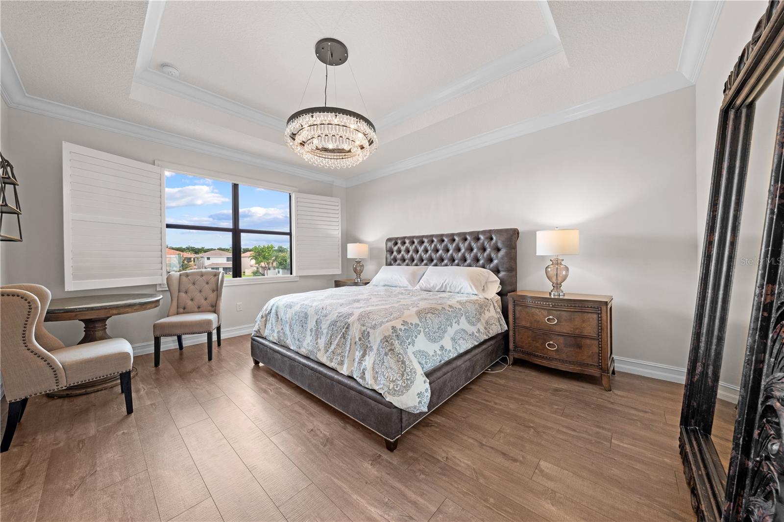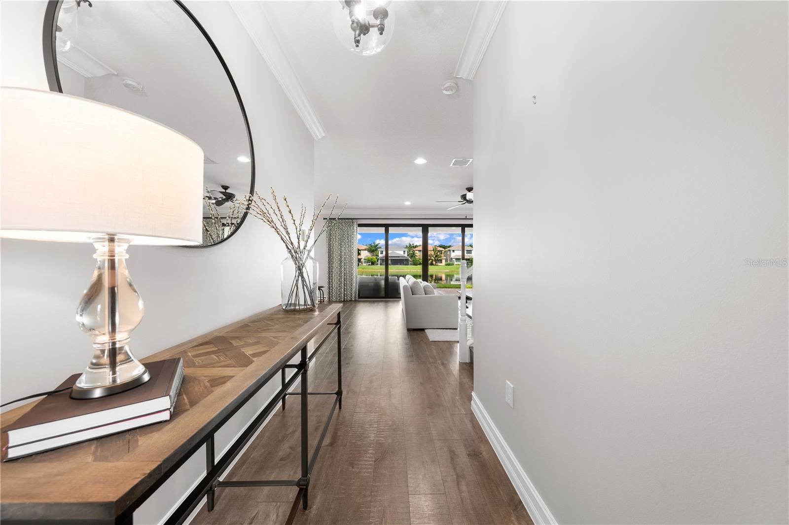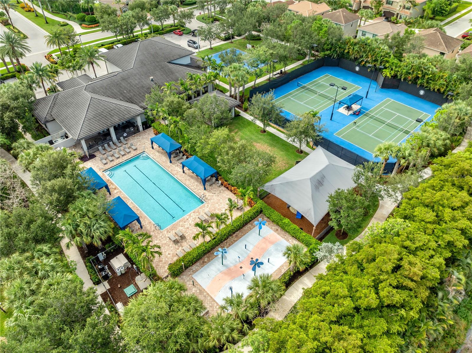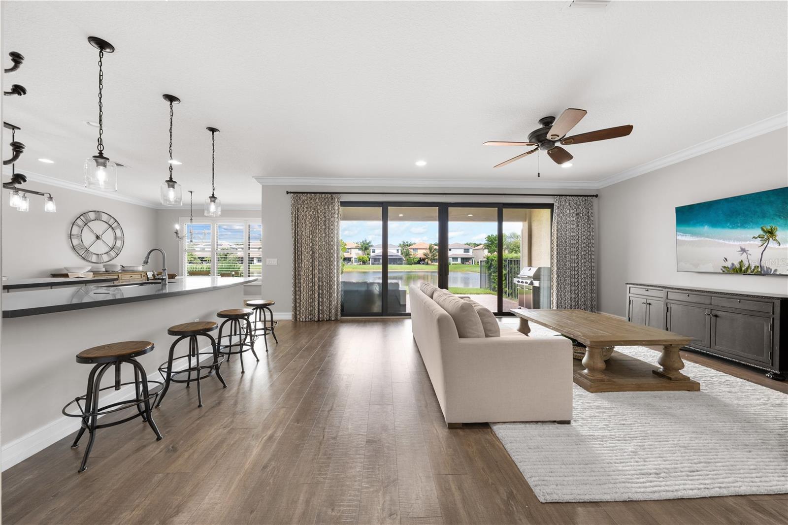 Welcome to this beautifully maintained, move-in ready two-story home, ideally situated on a premium lot with scenic water views in one of South Florida's most desirable gated communities. This 24/7 guard-gated neighborhood offers the perfect blend of resort-style living and everyday comfort.Step inside and experience timeless elegance paired with functional design. Wide-plank luxury vinyl flooring flows seamlessly through the main living areas and bedrooms, complemented by crown molding throughout. Plantation shutters provide privacy and style on the hurricane-impact windows, while custom drapery accents the sliding glass doors that open to an extended brick-paver patio--perfect for relaxing or entertaining. An extended brick-paver driveway adds both curb appeal and convenience.The entertainment-style kitchen is the heart of the home, featuring soft-close cabinetry, quartz countertops, a range with double ovens, an oversized island with surrounding storage, and an extended counter for casual seating and meal prep. A custom pantry adds additional organization. All kitchen appliances were installed in 2023. The kitchen opens effortlessly to the dining area and living room, creating a bright and open-concept living space.A full bedroom with a custom walk-in closet and a full bathroom are conveniently located on the first floor--ideal for guests or multigenerational living. Upstairs, you'll find a spacious secondary living area/flex space, a generous primary suite with two custom-built walk-in closets, and a private en suite bath featuring a garden tub. Two additional bedrooms and another full bathroom are also upstairs, along with a walk-in laundry room featuring tile flooring and abundant storage.Additional features include soft-close cabinetry and tile flooring in all bathrooms and the laundry room. A new air conditioning unit was installed in May 2025 for added peace of mind.The HOA provides exceptional value, covering lawn service, tree trimming, sidewalk pressure washing, and more--helping to keep the neighborhood pristine and worry-free.Residents also enjoy access to vacation-style amenities, including: A resort-style heated pool (winter) and cooled system (summer),canopy-covered seating, a splash pad, and covered playground.Indoor and outdoor basketball courts, pickleball and tennis courts, and a fully equipped, air-conditioned fitness center, and a stylish clubhouse with indoor card room and rentable event space.Lush tropical landscaping surrounds the entire community, creating an upscale, family-friendly atmosphere you'll love coming home to.