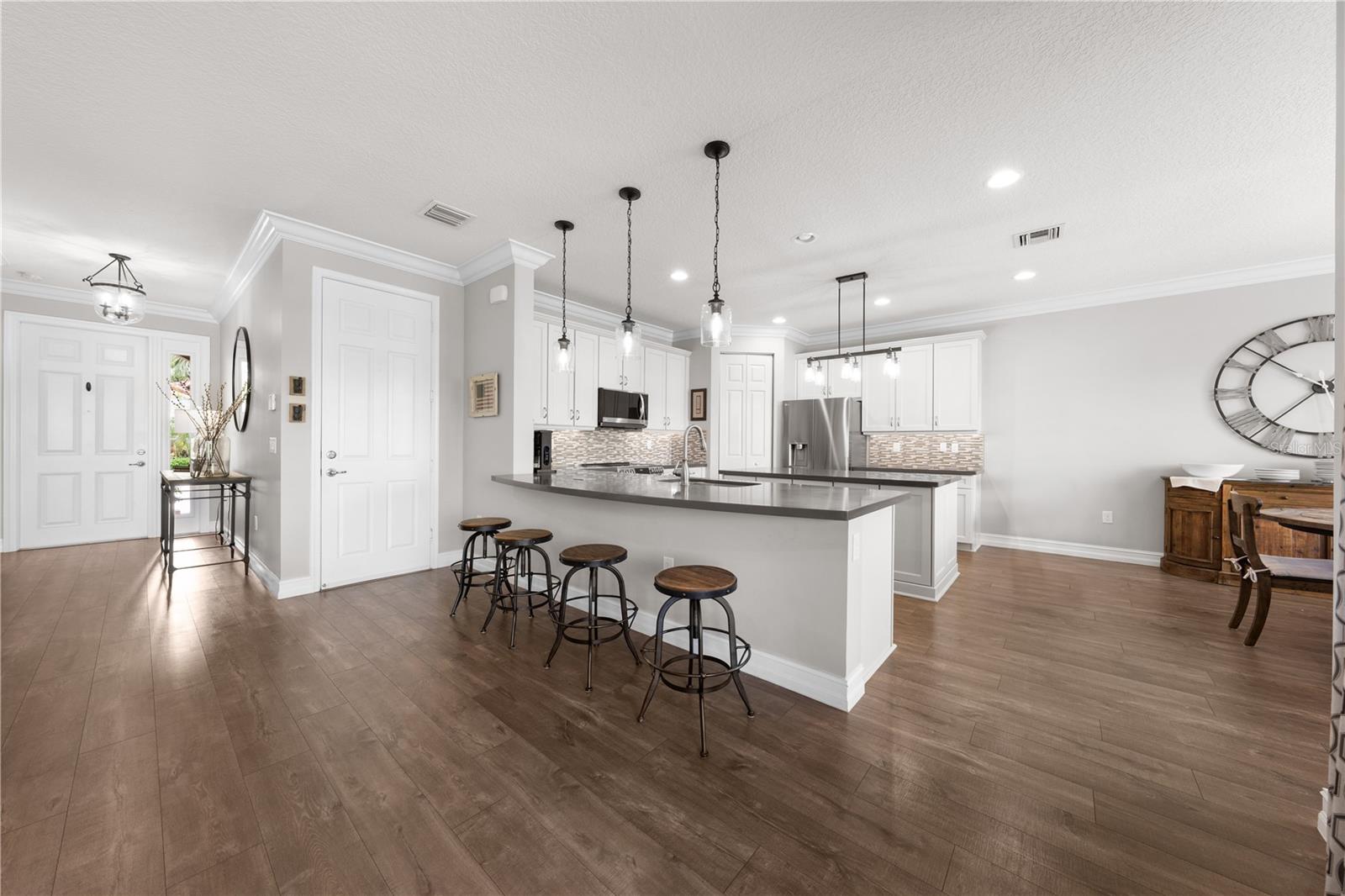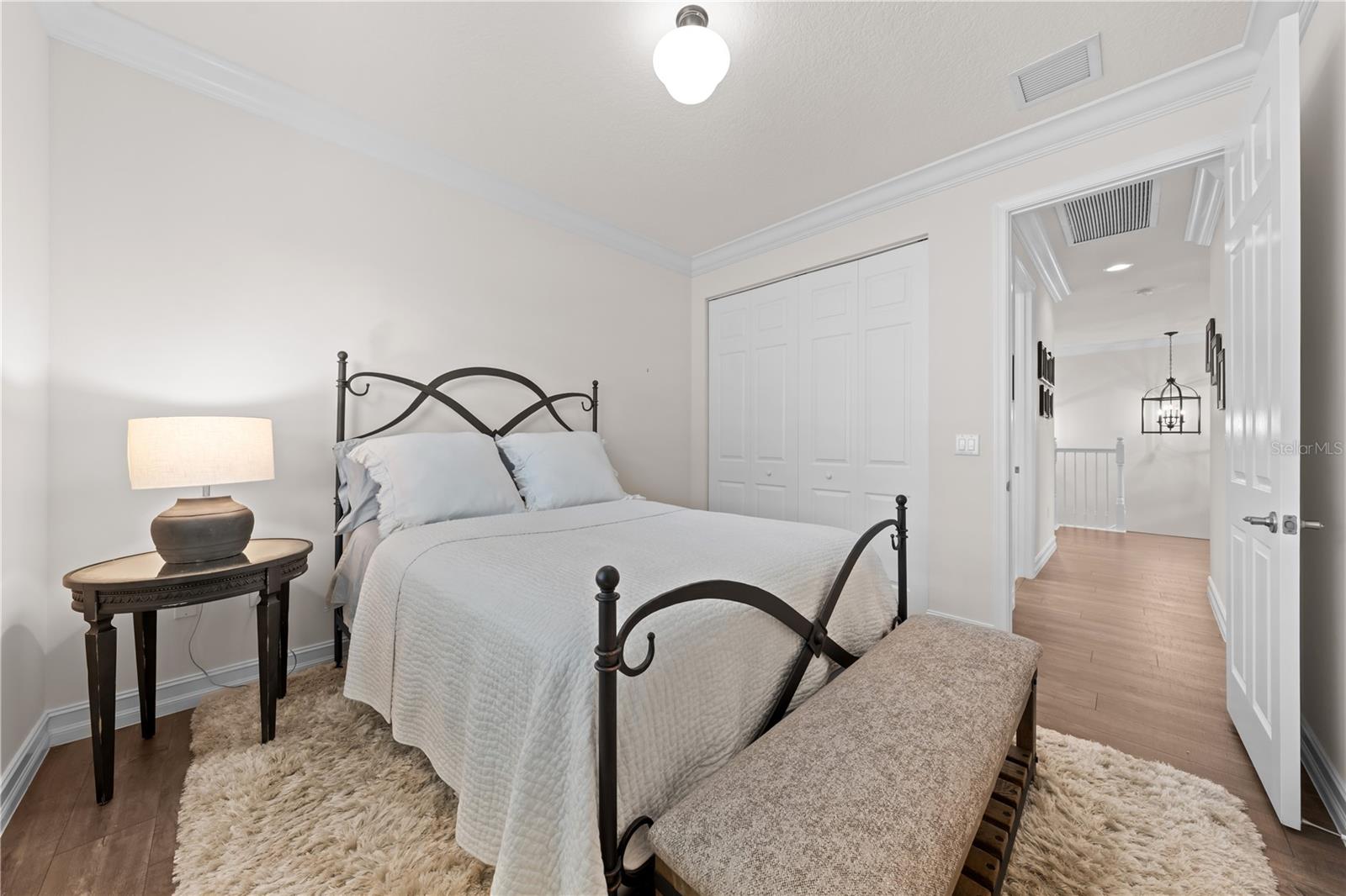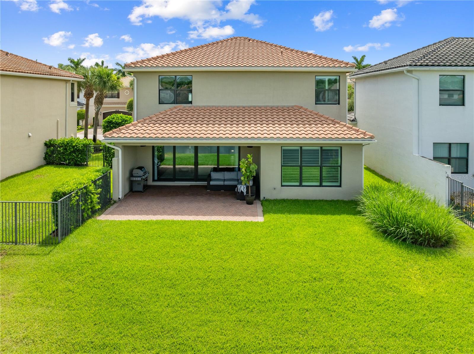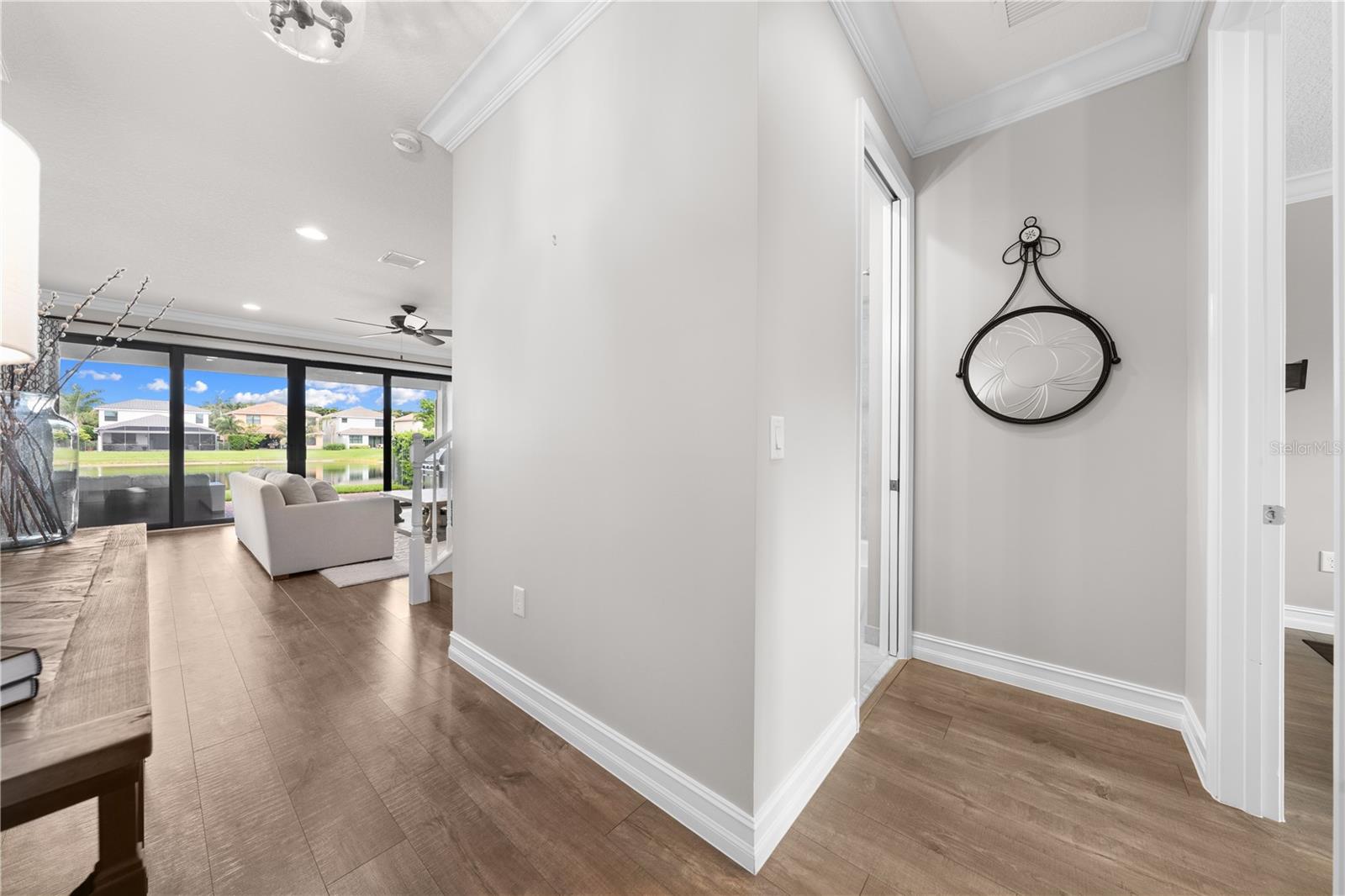 Welcome to this beautifully maintained, move-in ready two-story home, ideally situated on a premium lot with scenic water views in one of South Florida's most desirable gated communities. This 24/7 guard-gated neighborhood offers the perfect blend of resort-style living and everyday comfort.Step inside and experience timeless elegance paired with functional design. Wide-plank luxury vinyl flooring flows seamlessly through the main living areas and bedrooms, complemented by crown molding throughout. Plantation shutters provide privacy and style on the hurricane-impact windows, while custom drapery accents the sliding glass doors that open to an extended brick-paver patio--perfect for relaxing or entertaining. An extended brick-paver driveway adds both curb appeal and convenience.The entertainment-style kitchen is the heart of the home, featuring soft-close cabinetry, quartz countertops, a range with double ovens, an oversized island with surrounding storage, and an extended counter for casual seating and meal prep. A custom pantry adds additional organization. All kitchen appliances were installed in 2023. The kitchen opens effortlessly to the dining area and living room, creating a bright and open-concept living space.A full bedroom with a custom walk-in closet and a full bathroom are conveniently located on the first floor--ideal for guests or multigenerational living. Upstairs, you'll find a spacious secondary living area/flex space, a generous primary suite with two custom-built walk-in closets, and a private en suite bath featuring a garden tub. Two additional bedrooms and another full bathroom are also upstairs, along with a walk-in laundry room featuring tile flooring and abundant storage.Additional features include soft-close cabinetry and tile flooring in all bathrooms and the laundry room. A new air conditioning unit was installed in May 2025 for added peace of mind.The HOA provides exceptional value, covering lawn service, tree trimming, sidewalk pressure washing, and more--helping to keep the neighborhood pristine and worry-free.Residents also enjoy access to vacation-style amenities, including: A resort-style heated pool (winter) and cooled system (summer),canopy-covered seating, a splash pad, and covered playground.Indoor and outdoor basketball courts, pickleball and tennis courts, and a fully equipped, air-conditioned fitness center, and a stylish clubhouse with indoor card room and rentable event space.Lush tropical landscaping surrounds the entire community, creating an upscale, family-friendly atmosphere you'll love coming home to.