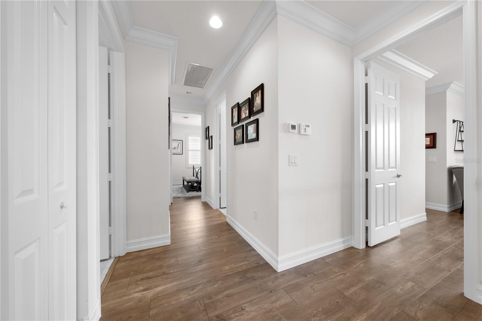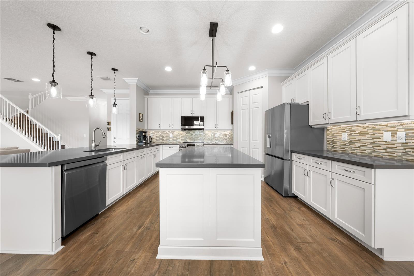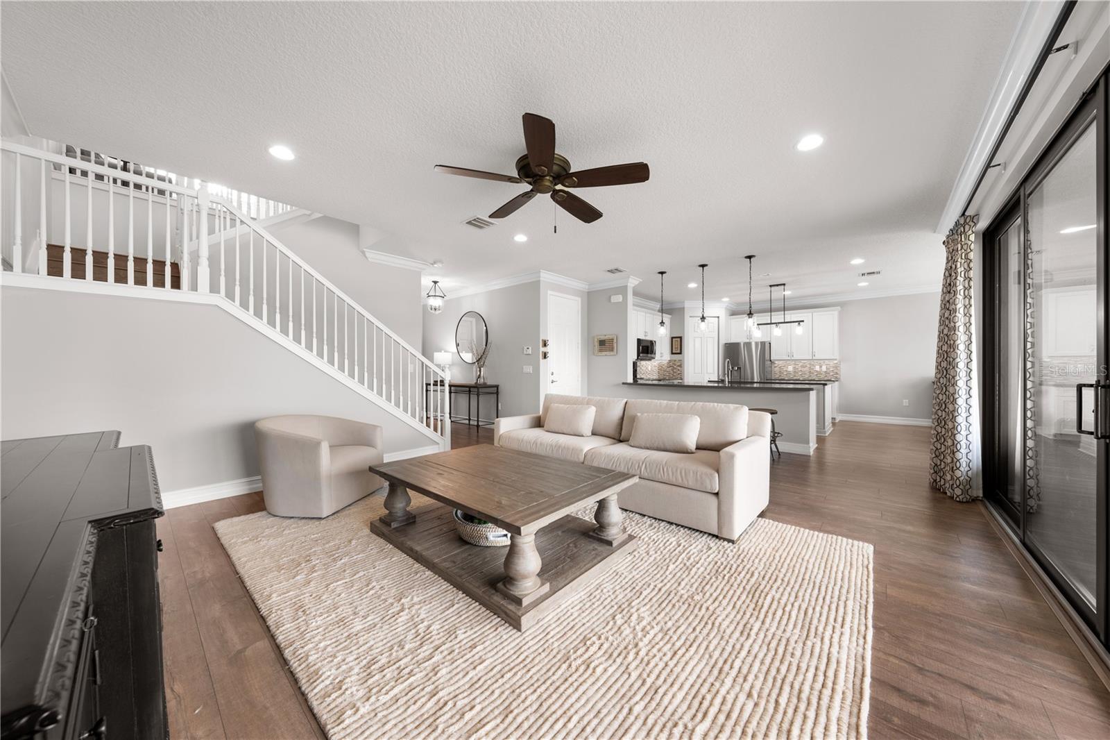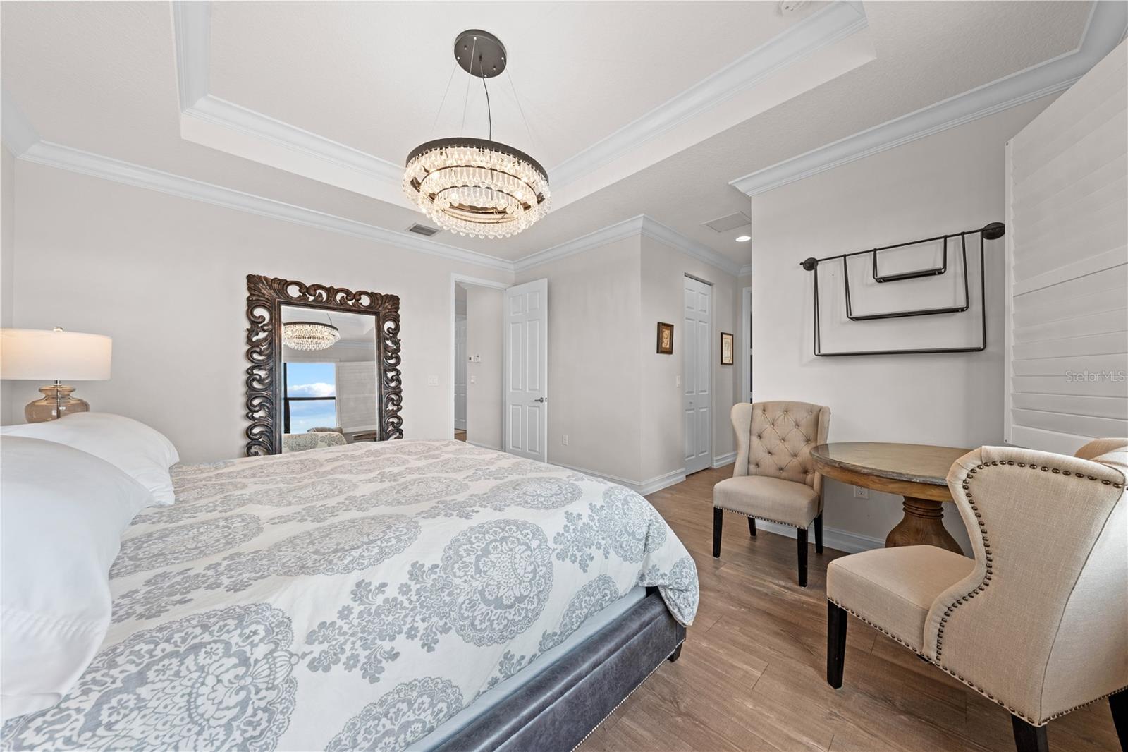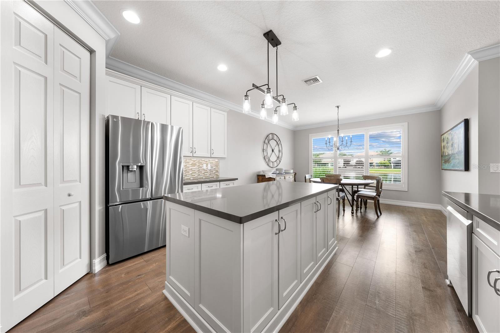 Welcome to this beautifully maintained, move-in ready two-story home, ideally situated on a premium lot with scenic water views in one of South Florida's most desirable gated communities. This 24/7 guard-gated neighborhood offers the perfect blend of resort-style living and everyday comfort.Step inside and experience timeless elegance paired with functional design. Wide-plank luxury vinyl flooring flows seamlessly through the main living areas and bedrooms, complemented by crown molding throughout. Plantation shutters provide privacy and style on the hurricane-impact windows, while custom drapery accents the sliding glass doors that open to an extended brick-paver patio--perfect for relaxing or entertaining. An extended brick-paver driveway adds both curb appeal and convenience.The entertainment-style kitchen is the heart of the home, featuring soft-close cabinetry, quartz countertops, a range with double ovens, an oversized island with surrounding storage, and an extended counter for casual seating and meal prep. A custom pantry adds additional organization. All kitchen appliances were installed in 2023. The kitchen opens effortlessly to the dining area and living room, creating a bright and open-concept living space.A full bedroom with a custom walk-in closet and a full bathroom are conveniently located on the first floor--ideal for guests or multigenerational living. Upstairs, you'll find a spacious secondary living area/flex space, a generous primary suite with two custom-built walk-in closets, and a private en suite bath featuring a garden tub. Two additional bedrooms and another full bathroom are also upstairs, along with a walk-in laundry room featuring tile flooring and abundant storage.Additional features include soft-close cabinetry and tile flooring in all bathrooms and the laundry room. A new air conditioning unit was installed in May 2025 for added peace of mind.The HOA provides exceptional value, covering lawn service, tree trimming, sidewalk pressure washing, and more--helping to keep the neighborhood pristine and worry-free.Residents also enjoy access to vacation-style amenities, including: A resort-style heated pool (winter) and cooled system (summer),canopy-covered seating, a splash pad, and covered playground.Indoor and outdoor basketball courts, pickleball and tennis courts, and a fully equipped, air-conditioned fitness center, and a stylish clubhouse with indoor card room and rentable event space.Lush tropical landscaping surrounds the entire community, creating an upscale, family-friendly atmosphere you'll love coming home to.